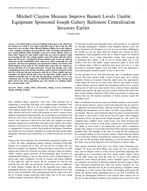Tristain Juan "Mitchell Clayton Measure Improve Barnett Levels Unable Equipment Sponsored Joseph Gallery Baltimore Centralization Investors Earlier". IEEE Exploration in Machine Learning, 2022.